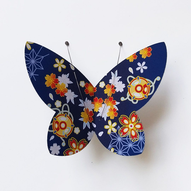 Papillon-magnet en papier imprimé recto-verso.